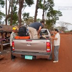 Iz Phnom Pena sva se z busom podala do Snoula cca 5ur za 22000R / osebo, kjer sva izstopila in poiskal nov prevoz proti Sen Monorom-u. Gor ne pelje noben avtobus so nama zatrjevali in nek turist v restavraciji je čakal že en cel dan na prevoz, a ga ni dobil. No midva sva se podala do prvega križišča, kjer je Aleš povprašal pri prvem pick-upu, ki je prišel mimo, če se lahko peljeva zraven. Prijazni šofer je potrdil in tako sva bila že dve uri kasneje v malem nestecu Sen Monorom. Do tja sva se peljala v zadnjem odprtem delu pick-upa, poleg naju pa je imel Aleš še eno soptnico in sicer kokoško. No, gor sva prišla in to zastonj.