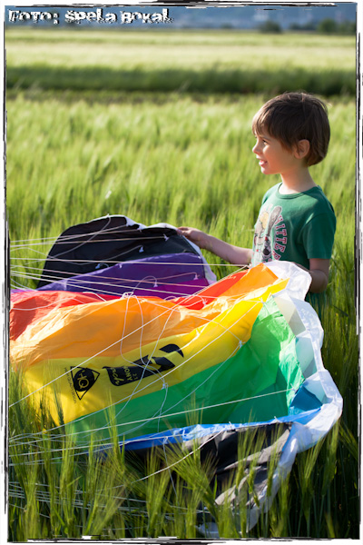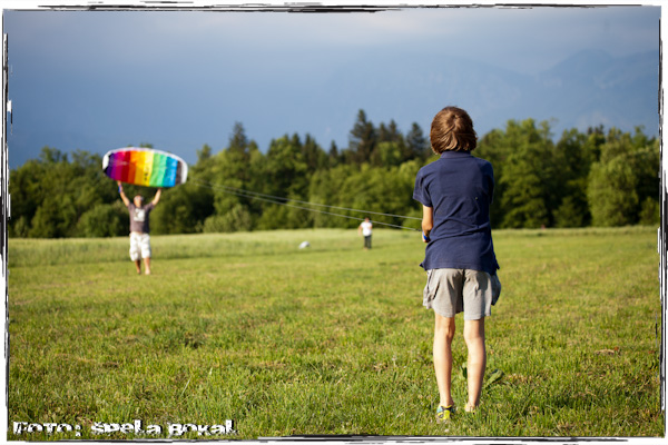 Ravno se je zoblačilo in pripravilo na eno hitro ploho, kar je pomenilo dober veter in hitro smo poiskali kajte in se z nečaki odpravili na bližnje polje. Dober veter, svetloba skoraj idealna za narest kak posnetek, lokacija ok! Sunki vetra so bili precej močni, tako da so mene in mlajša nečaka kar nekajkrat prestavili za kak meter, pa čeprav smo imeli male kajte 1.3m in 2.1m, a moram reči, da so skoraj 3 ure minile kot bi mignil!