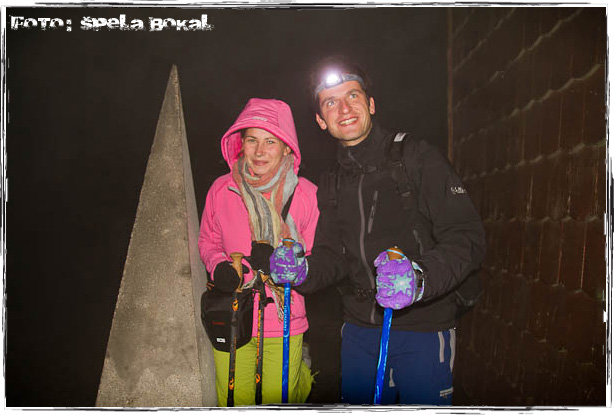 V hrib smo zagrizli kar pozno, saj je ura že odbila 20.00. Vztrajno smo se dvigali in ob soju polne lune in male čelne svetilke korakali vse bližje cilju. Nekje na 2/3 nas je počasi začela zapuščati luna in pokazale se so prve snežne zaplate iz preteklega tedna. Vrh smo osvojili po dobri uri hoje, a nismo pretirano hiteli. Spodaj je samo nekaj fotk kot dokaz, da smo res bili na vrhu, kajti zunaj sredi noči, ni bilo prav toplo in na vrhu je kar pošteno pihalo.