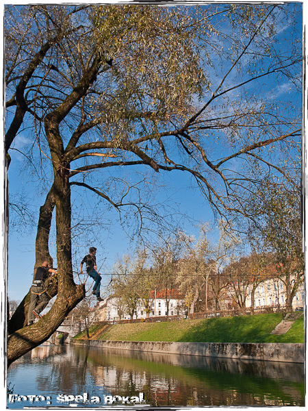 Res je bil lep jesenski dan, ko so se odločili, da po treningu na Gradaščici tokrat slackline postavijo čez Ljubljanico! In to se je tudi zgodilo. Slackline so napeli do drevesa na eni strani brega do drevesa na drugi strani reke Ljubljanice. Vse skupaj je kar trajalo nekaj časa, da je prvi pogumnež stopil na slack ali gurtno po domače, kajti razdalja med enim in drugim koncem je bila 35m ali več. Seveda