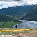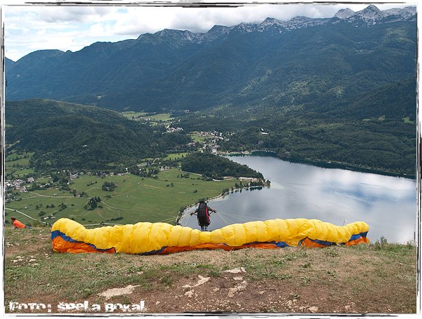 Za izhodišče sva izbrale parkirišče pri cerkvi v Stari Fužini in pot nadaljevali najprej po asfaltni cesti, nato pa sva zavile levo v bukov gozd, kjer vodi do vrha skoraj da tlakovana kamnita pot. Moram reči, da sama pot ni ne vem kaj zanimiva, prav zaradi velikih že precej zglajenih kamnih in precej strmi poti navzgor. Nekaj 100 m pred vrhom je znano odskočišče za jadralne padalce in tako imenovane skoke v tandemu, od koder imamo prvič pogled na Bohinjsko jezero. Seveda sem imela s seboj fotoaparat in že tukaj je nastalo kar nekaj fotk, saj je bilo polno jadralnih padalcev, ki so čakali na svoj skok v dolino! Od tu sva se povzpeli še do koče nekaj 100 m naprej, kjer sta naju že čakala kolesarja!